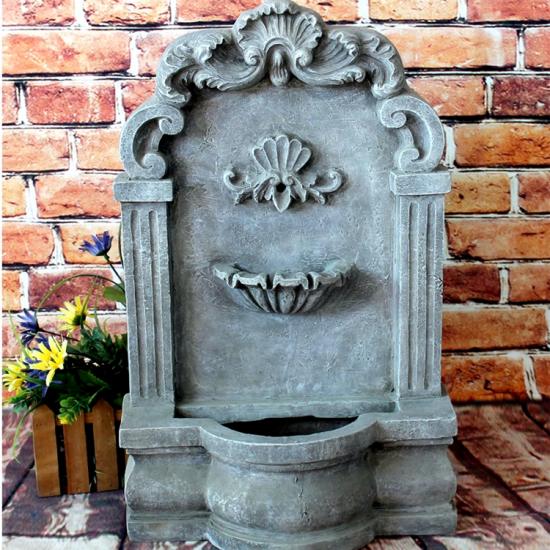 Lion Head Polyresin Wall Mounted Water Feature Luxury Style Standing Fountain Dreamy design accents add a romantic touch to this handmade outdoor water fountainSolor powered water fountain easy to install, do not need any wiring. Save much installation and labor cost. This design have 5 colors for your alternative.